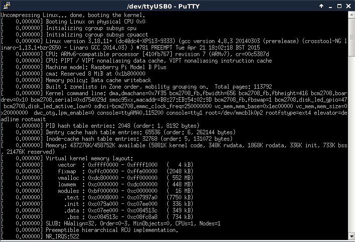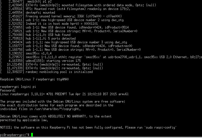 The Raspberry Pi has a number of ways it can enter commands and output results. One of the easiest to use is a keyboard, mouse, and the HDMI output; however, if you are working on an embedded project that does not use all these devices, you can also log in on a serial console, as well as view the boot kernel messages.